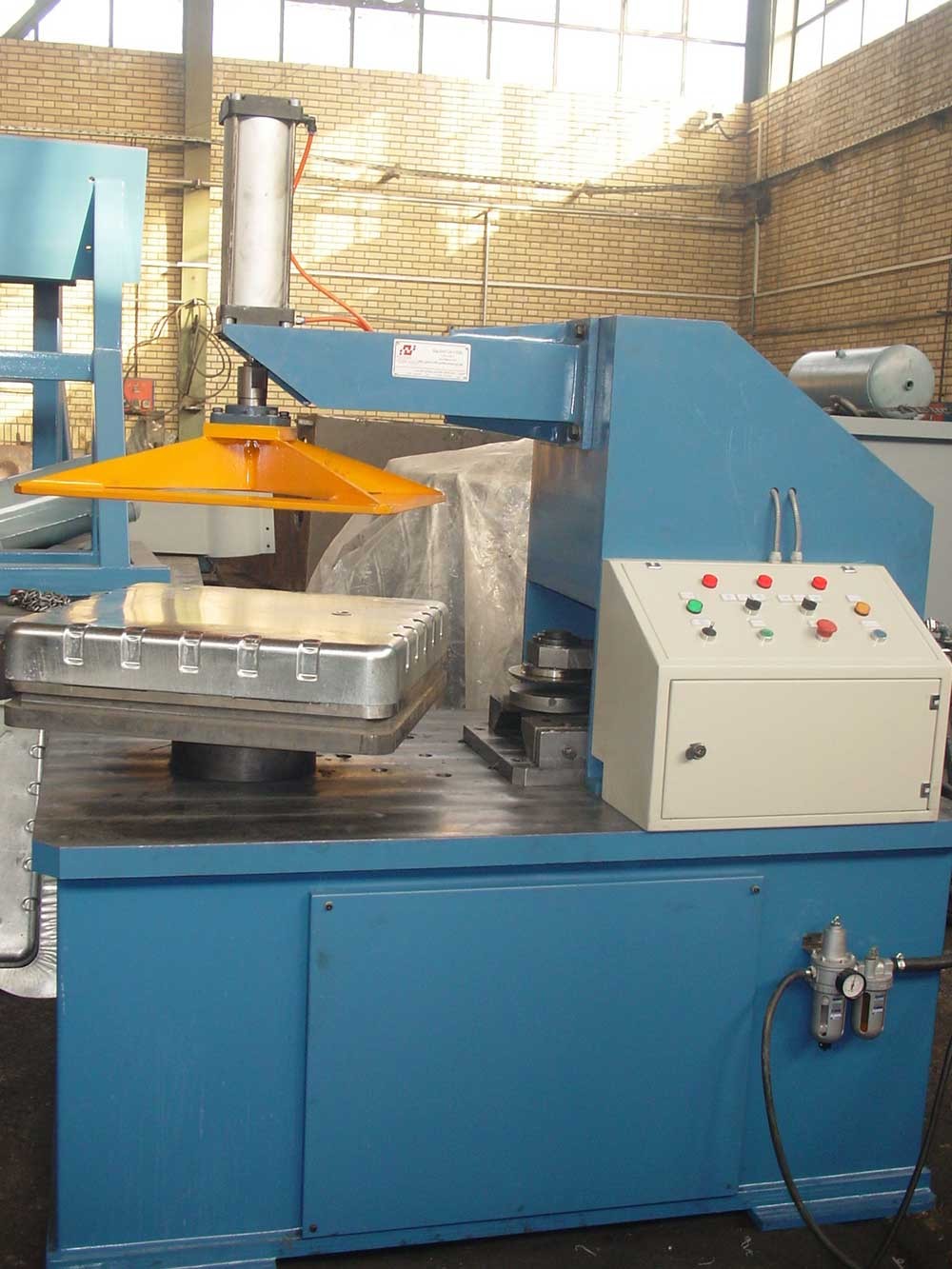 هذه الماكنة تستخدم لقطع الحافات الزائدة وغير المسطحة المتبقية حين إنتاج (شفط) غطاء آلة التبريد.